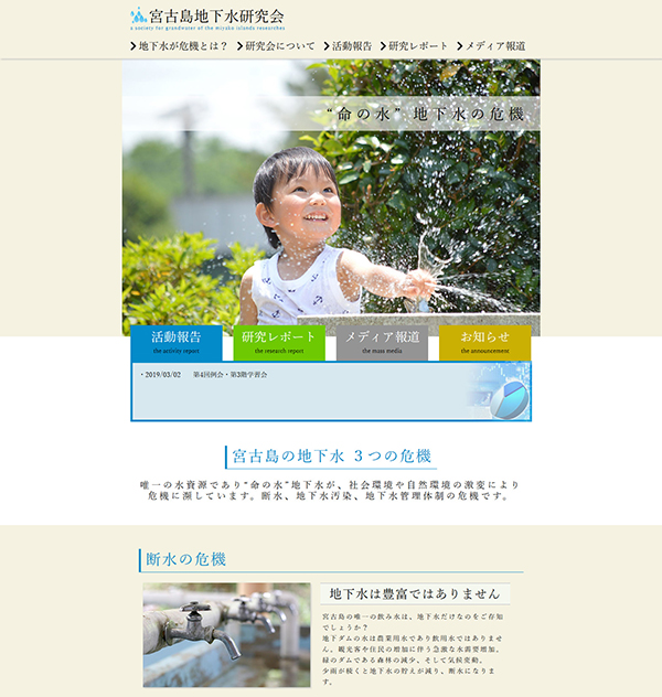 PC専用サイトです。イメージを「青、水色、緑色、透明感」とし、研究・水というかなり抽象的な素材をどのように可読性高くするかがポイントです。ついつい文章が多くなり、つまらなくなりがちなので、画像を適度に利用しました。