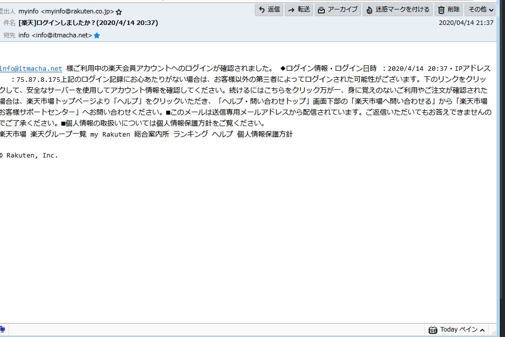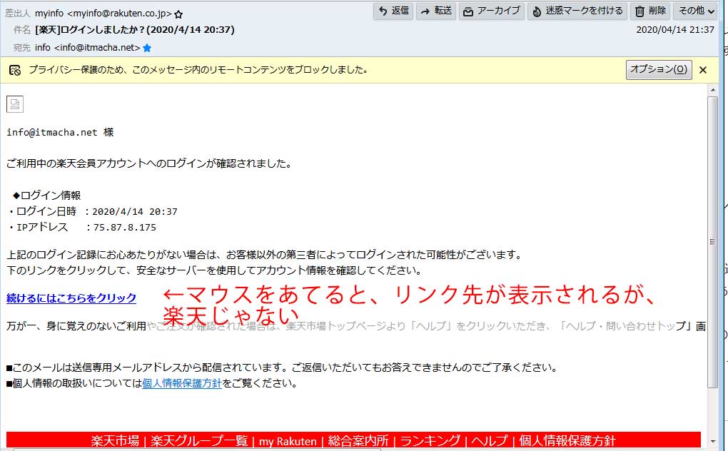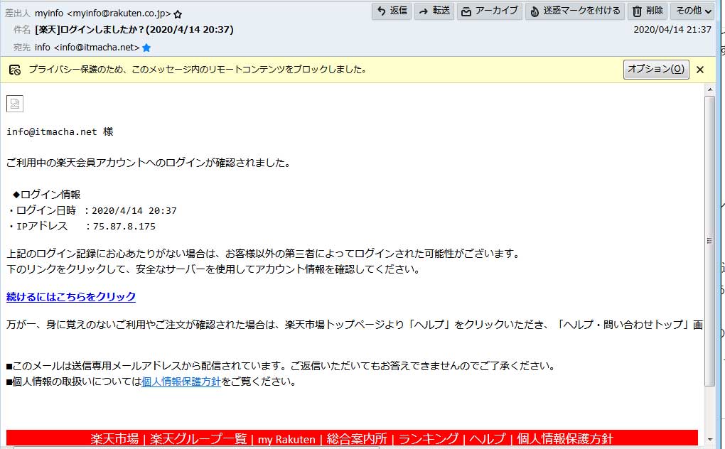 内容をよく読むとわかるのですが、「 ◆ログイン情報・ログイン日時 :2020/4/14 20:37・IPアドレス :75.87.8.175上記のログイン記録にお心あたりがない場合は、お客様以外の第三者によってログインされた可能性がございます。下のリンクをクリックして、安全なサーバーを使用してアカウント情報を確認してください。」と書いてるのに、リンクがありませんよね?